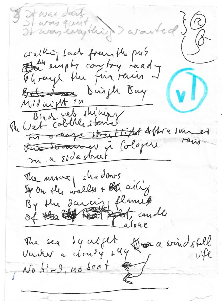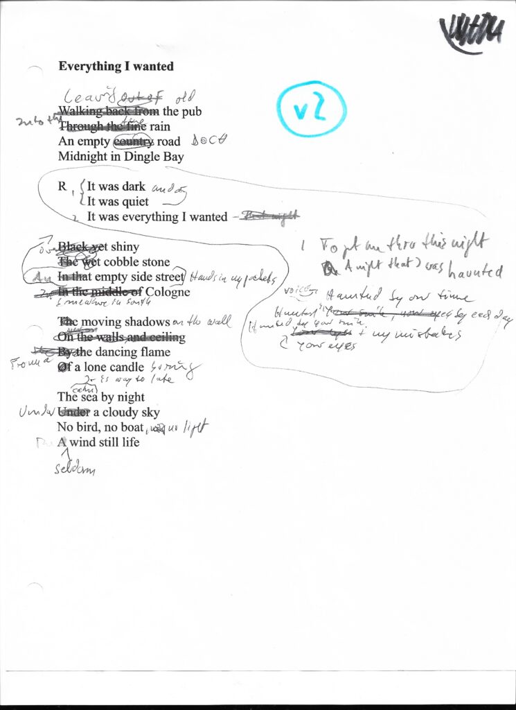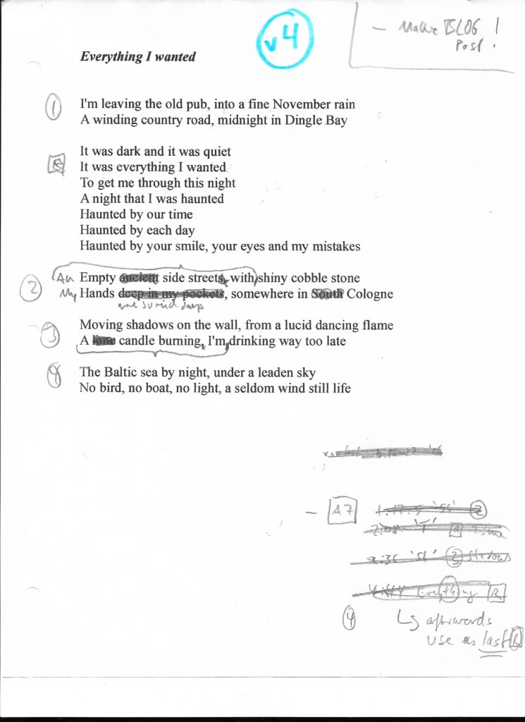 Again handwritten, that's rare. Because I had to do it in the studio (for over a year now I have the immense luck of sharing a studio space where it can be dark and quiet whenever I want it and nobody is there...) and there is no printer but I was ready to sing it in. So what can you do? I took the sharpie, and then, while recording tracks working in more changes. Words are like clay.