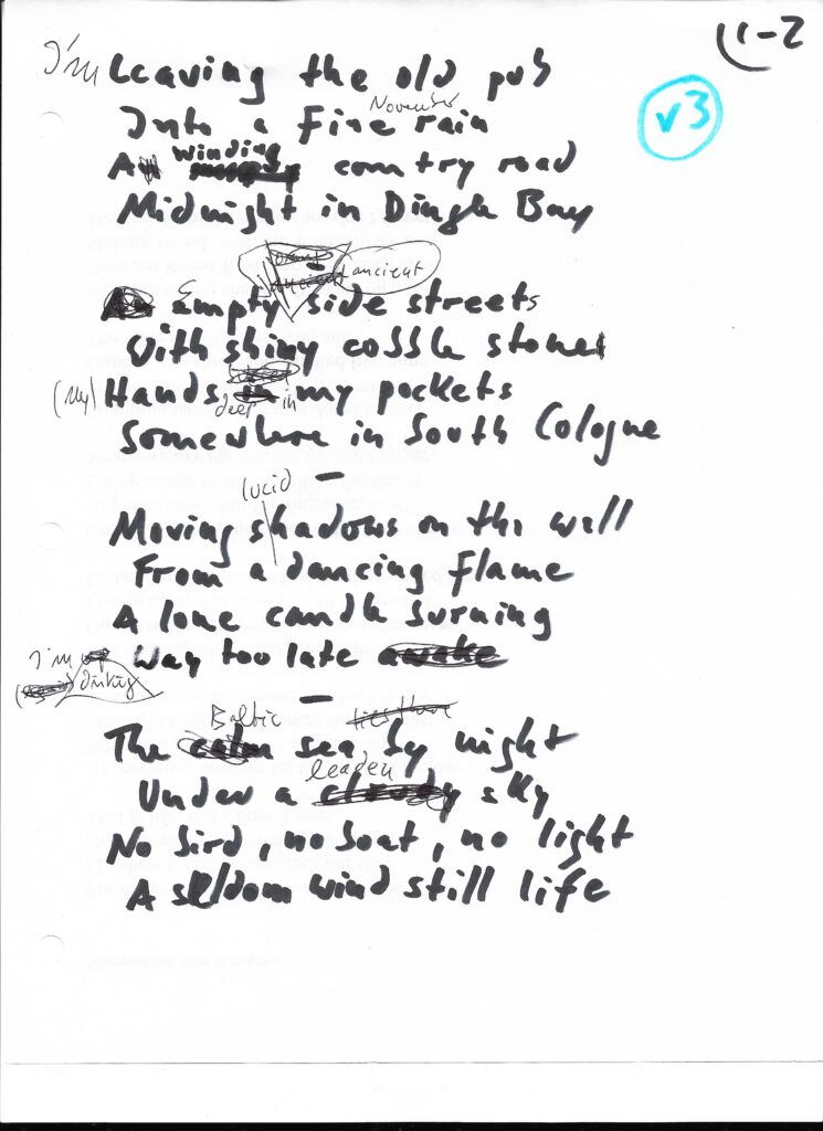 First changes, what do we have here? I scrapped “Behind me” (nice though, but without time of the day indication which now, with "midnight" means rather silence) and took “Midnight”. Dingle Bay, Ireland, yes, I was there, bloody young, my 1st backpacking trip, memorable, never knew this would pop up in a poem or a song, anyway ...